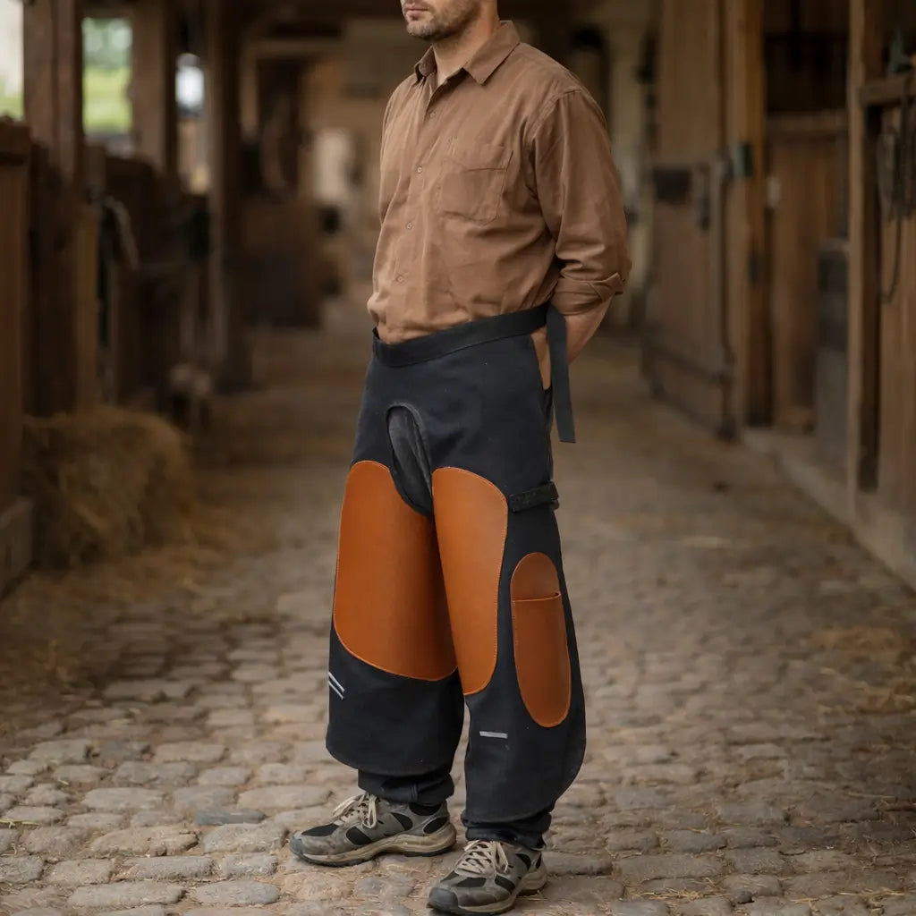 The extended shape protects thighs to knees from dirt, chips, and strain – ideal for precise work on horses.