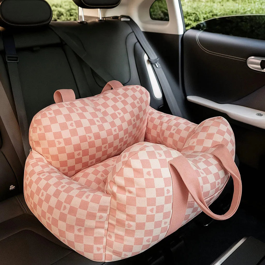 Hergestellt aus hochwertigem, leichtem Material mit seitlichen Taschen für Snacks & Spielzeug sowie einem doppelseitigen Kissen – ideal für lange Fahrten.
