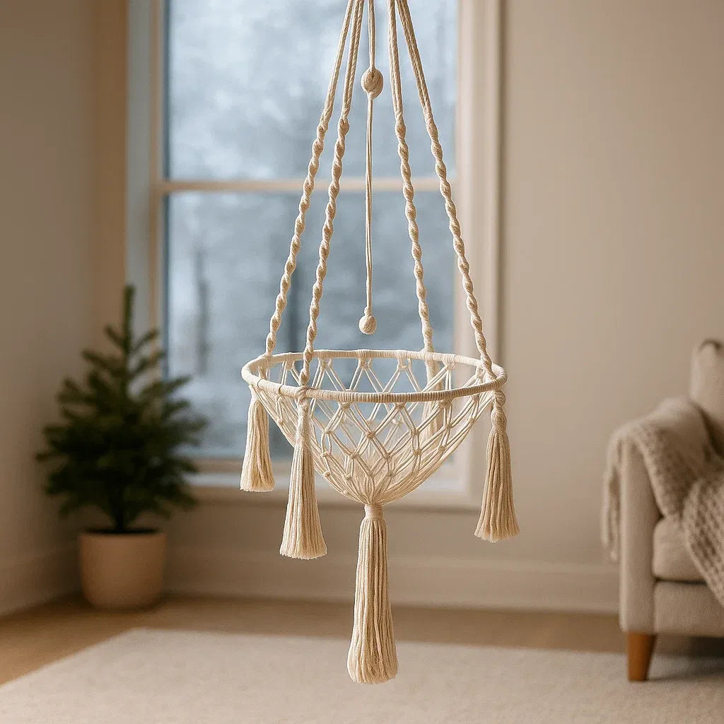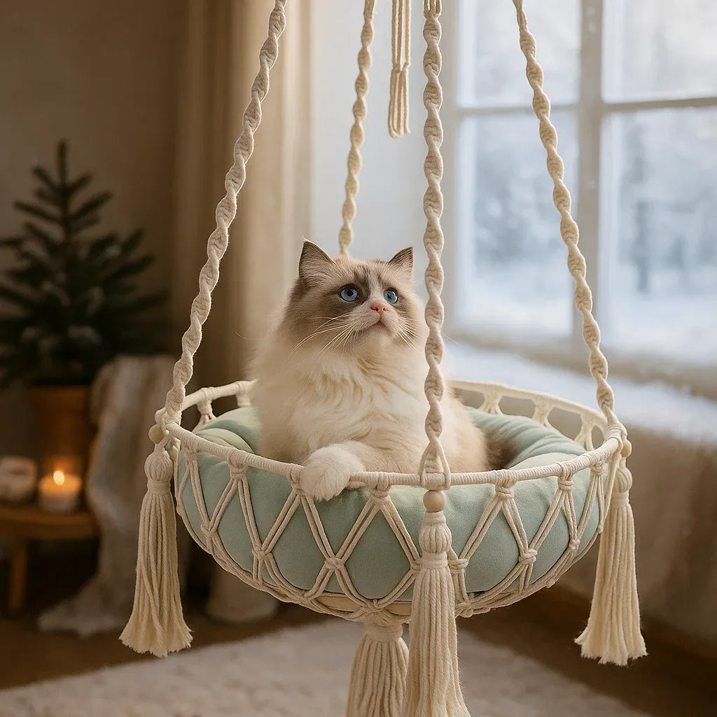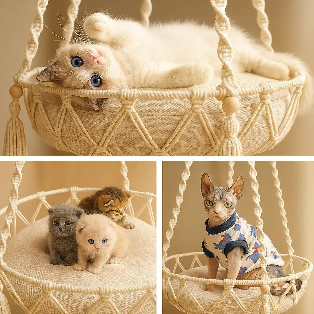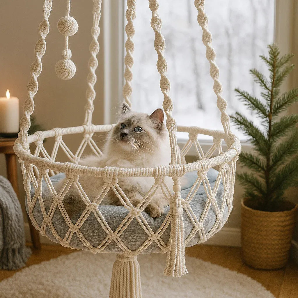 Geflochten aus hochwertiger Baumwollkordel, bietet es deiner Katze einen sicheren und gemütlichen Ruheplatz, perfekt zum Dösen, Kuscheln oder sanften Schaukeln. Das natürliche Makramee-Design fügt sich harmonisch in jede Einrichtung ein und bringt warmen Boho-Charme in dein Zuhause.