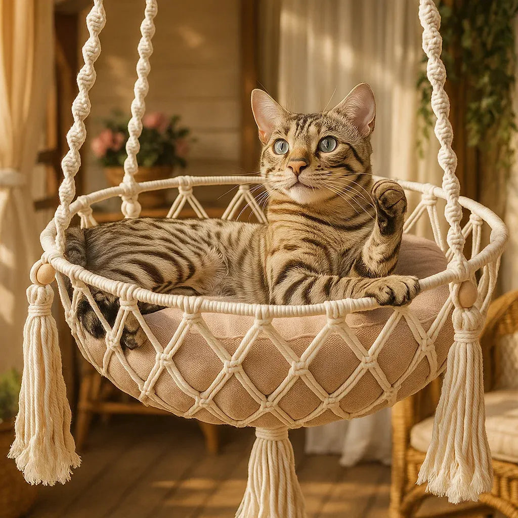 Dieses Boho-Katzenbett mit Hängematten-Design vereint handgefertigte Qualität mit stilvollem Wohnambiente.