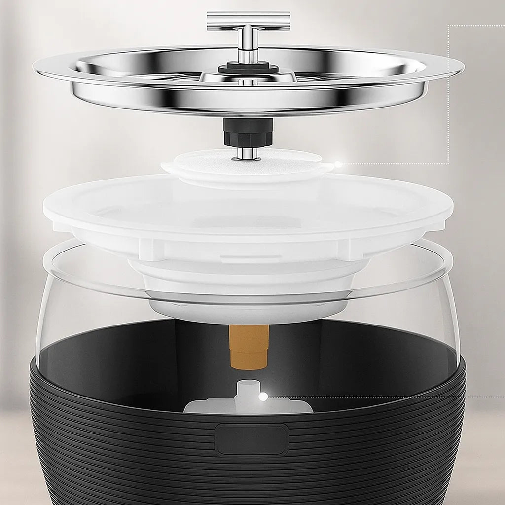 Der Brunnen besteht aus rostfreiem Stahl und verfügt über ein herausnehmbares Filtersystem – für eine dauerhaft saubere und frische Wasserquelle.