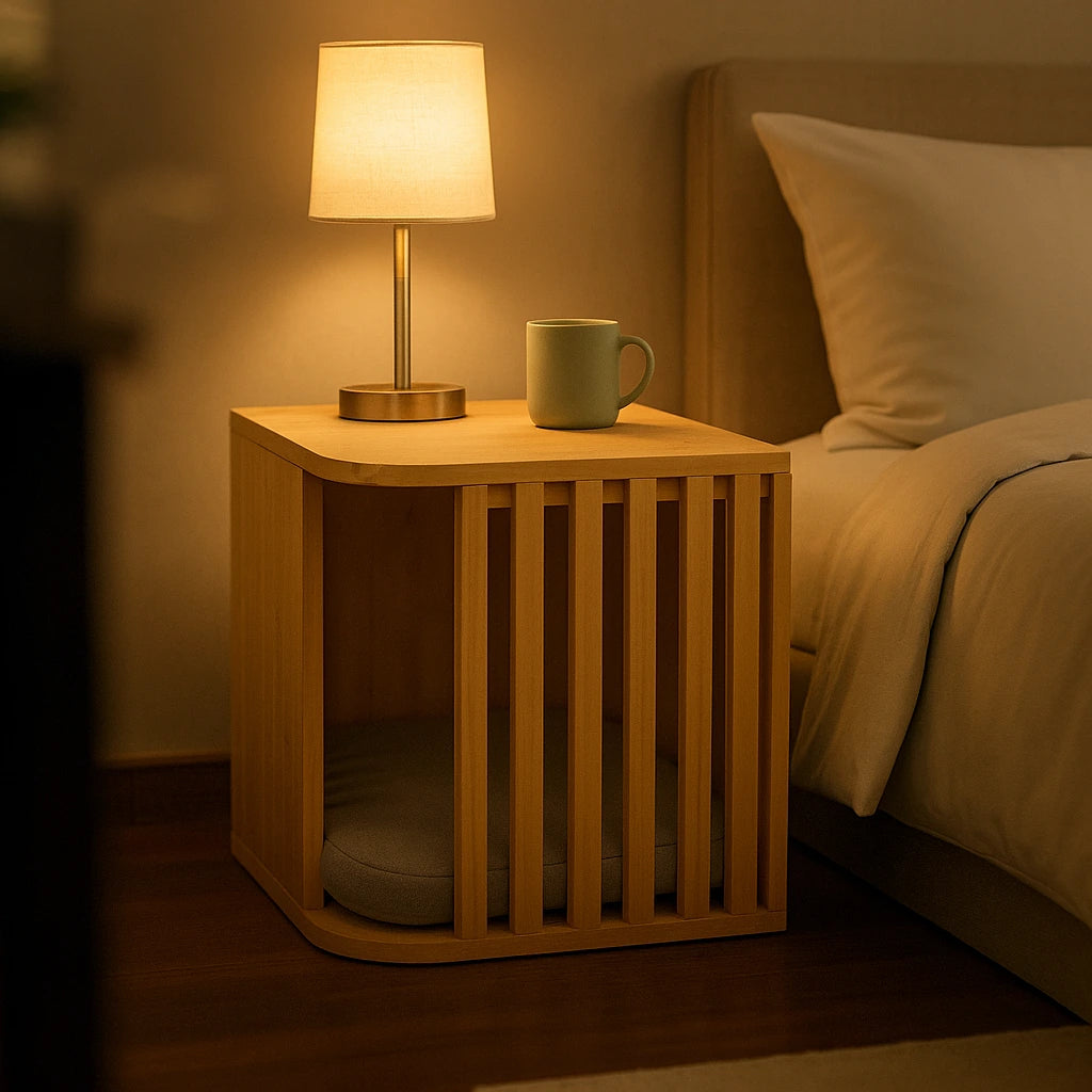 Dieses stilvolle Möbelstück kombiniert Funktionalität mit tierfreundlichem Design: Ein moderner Nachttisch, der gleichzeitig als gemütlicher Rückzugsort für deine Katze dient. Ideal für kleine Wohnungen oder minimalistische Räume, in denen jedes Möbelstück doppelt Sinn machen darf. Deine Katze bekommt ihren privaten Wohlfühlplatz – und du ein dekoratives, praktisches Einrichtungselement.