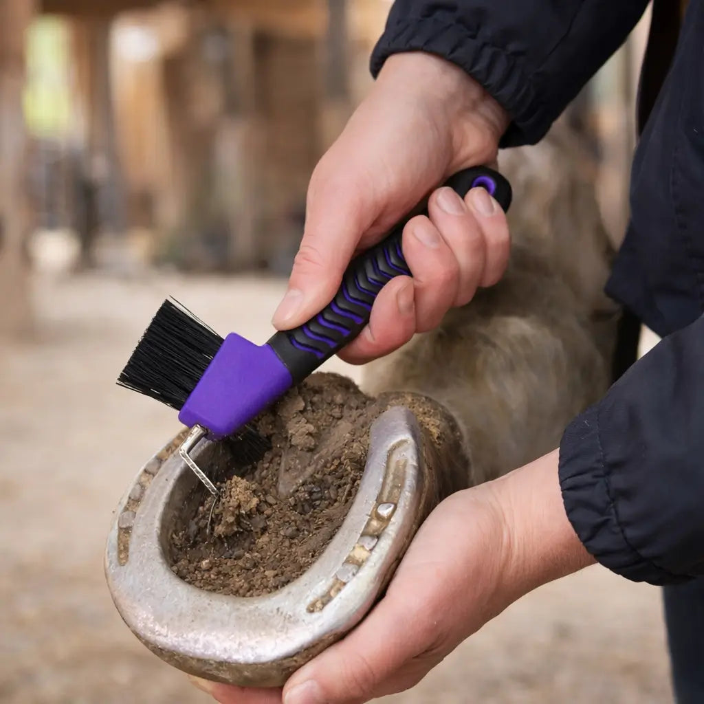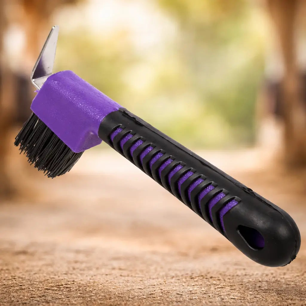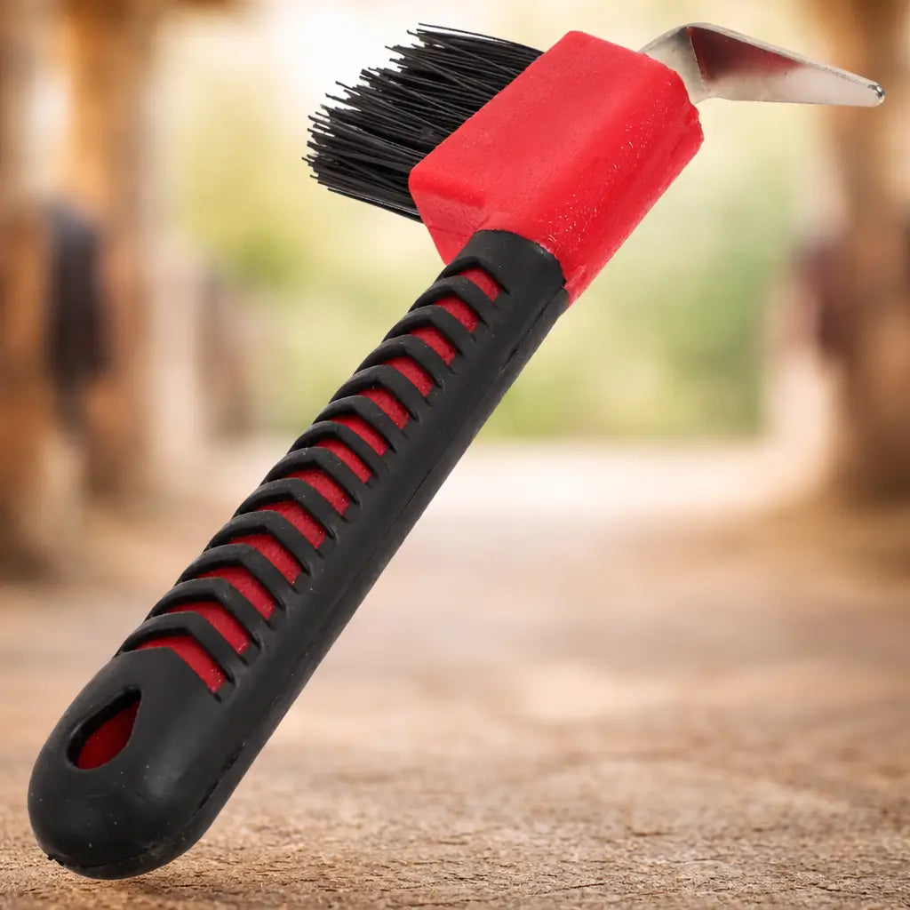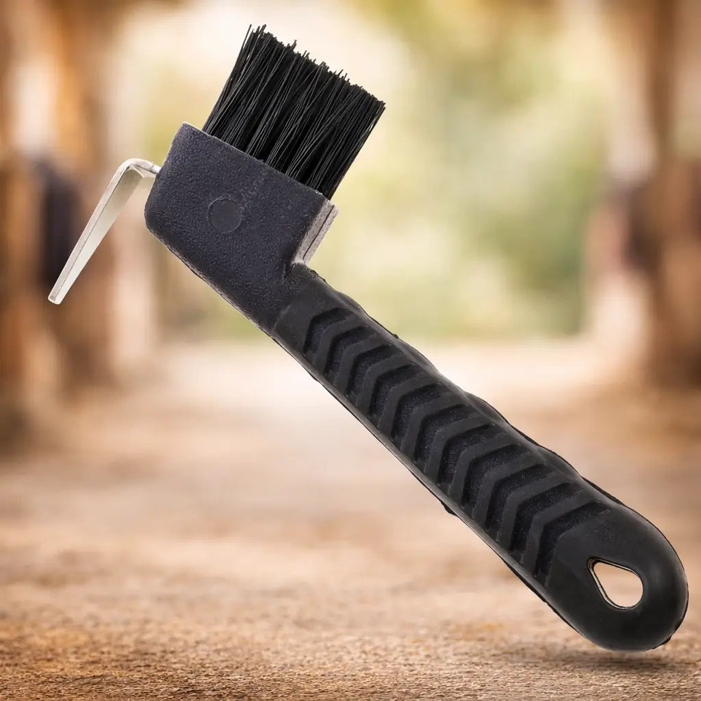 Schmutz, kleine Steine oder Schlamm können sich leicht in den Hufen deines Pferdes festsetzen. Mit diesem praktischen Hufkratzer mit Bürste lassen sich Hufe gründlich reinigen und pflegen – ideal für die tägliche Stallroutine vor oder nach dem Reiten.