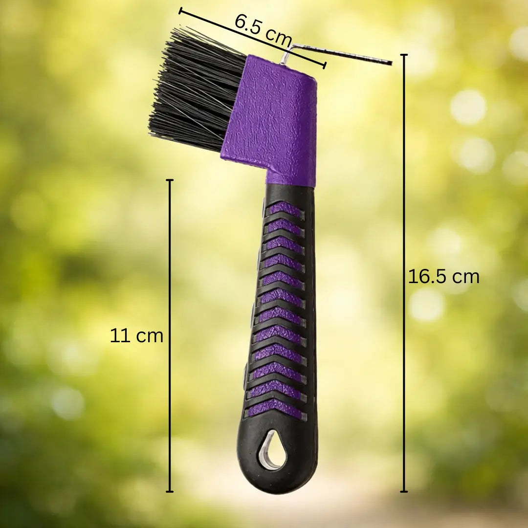 ● 2-in-1 Hufkratzer mit Bürste: Stabiler Edelstahlhaken entfernt festgesetzte Steine und Schmutz, während die Nylonbürste feine Rückstände aus dem Huf reinigt.