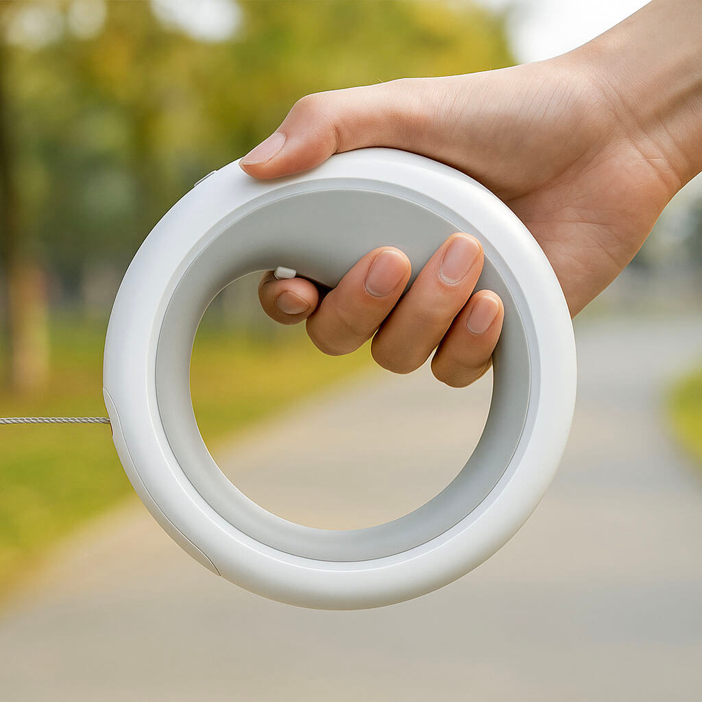 Die Leine lässt sich flexibel ein- und ausrollen, ideal für verschiedene Umgebungen, von Stadt bis Park.