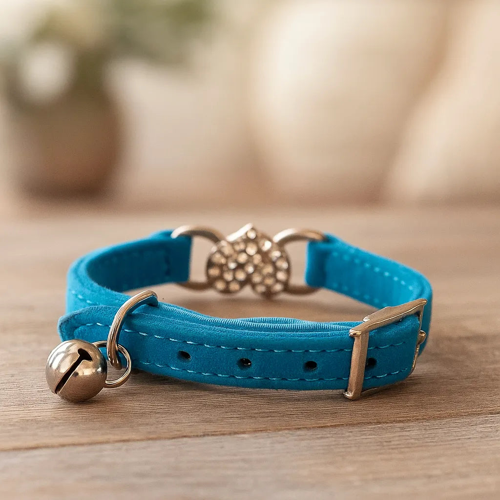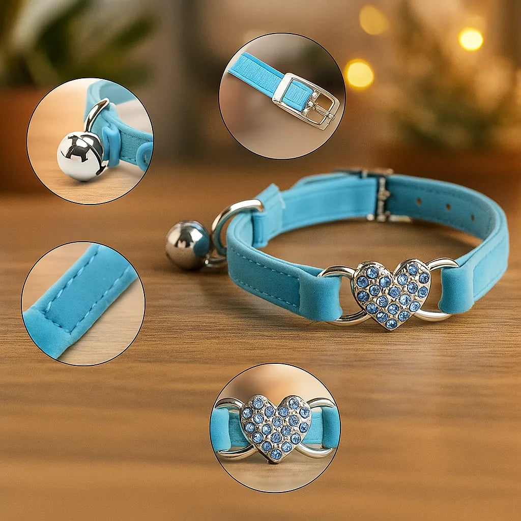 Katzenhalsband mit Herz & Glöckchen | Weiches Samtband mit Sicherheitsverschluss