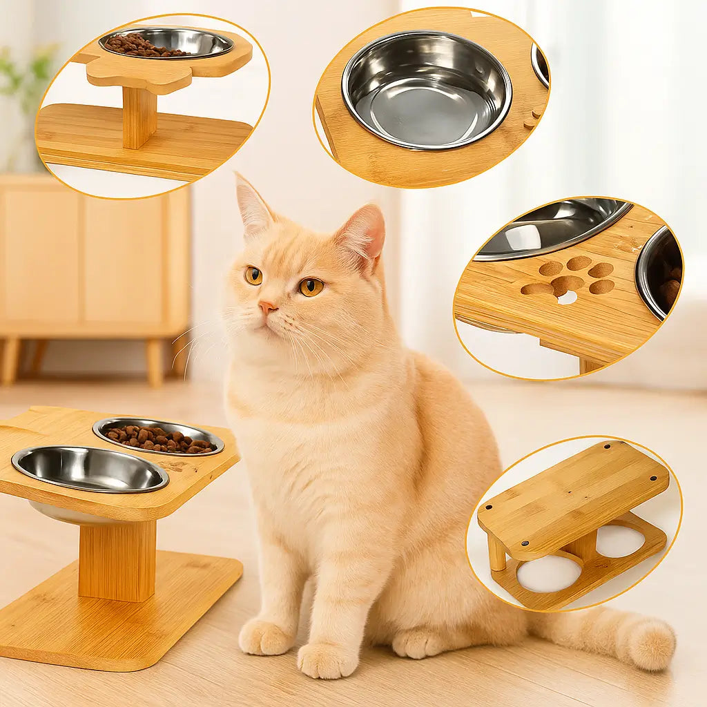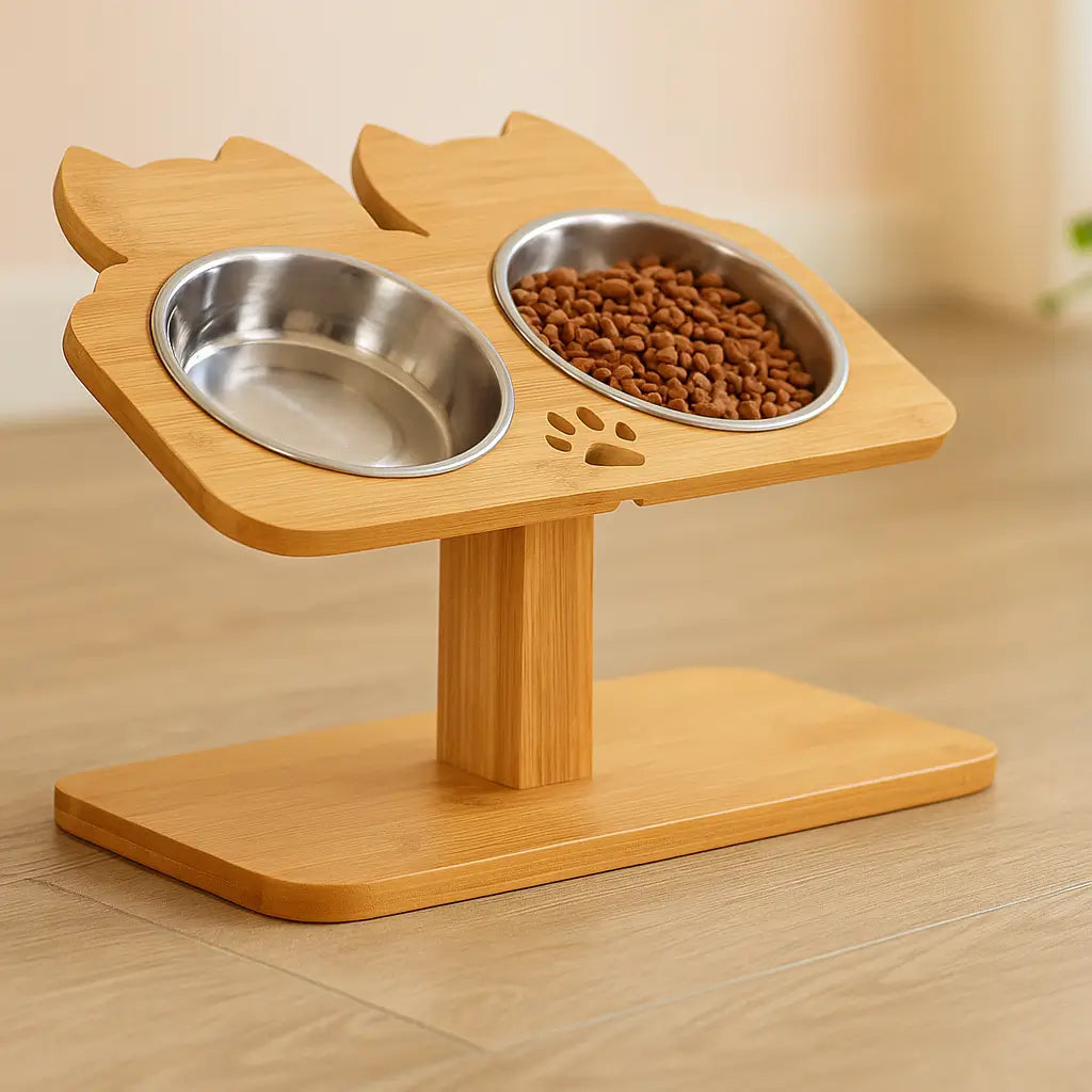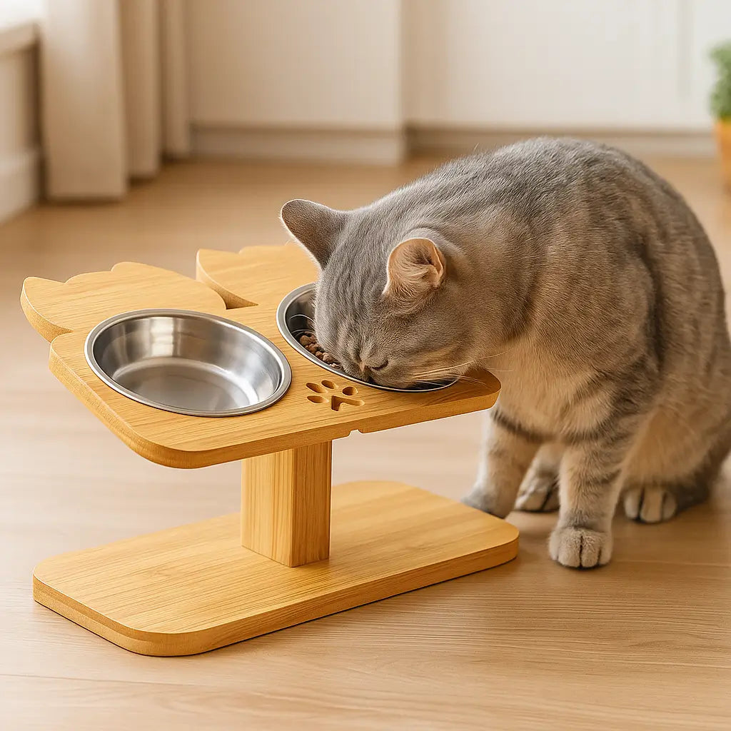 Dieser elegante Katzennapf aus Bambus vereint Design, Funktionalität und Komfort.