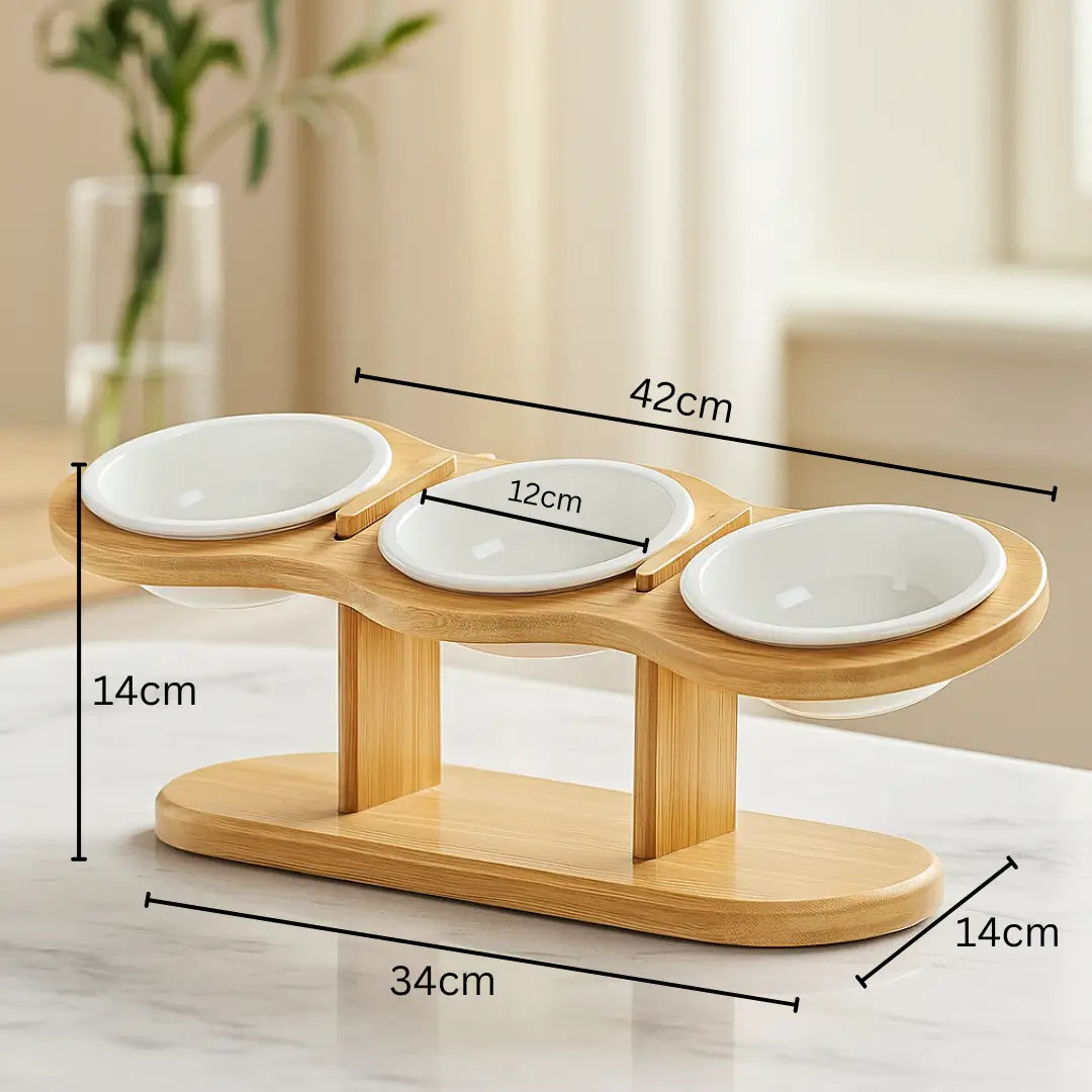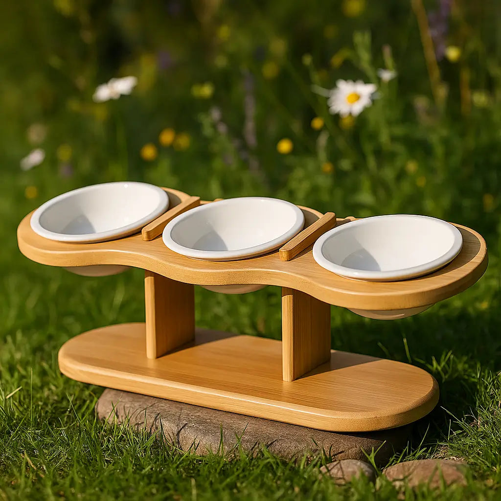 Keramik Katzennapf mit Bambusständer | Verstellbarer 3er Futterplatz