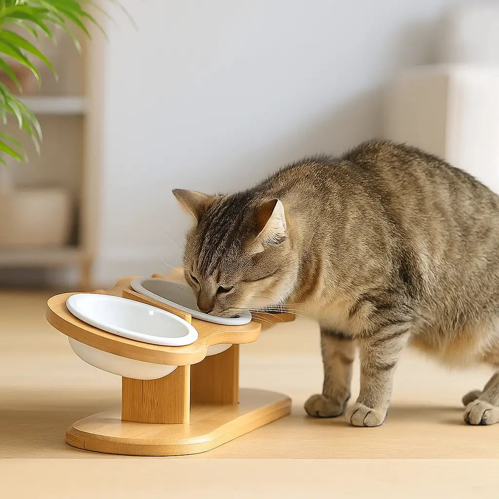 Dieser elegante Katzennapf mit stabilem Bambusständer verbindet Komfort, Hygiene und modernes Design.