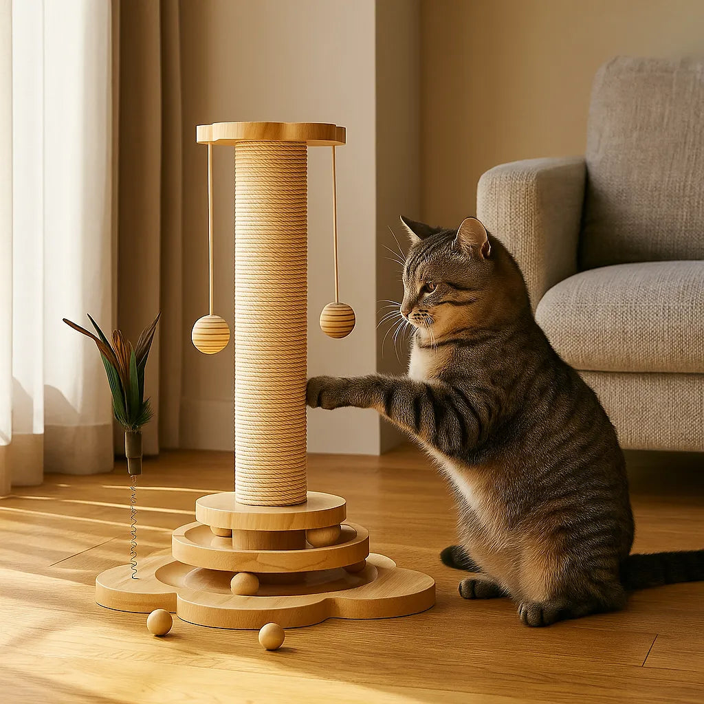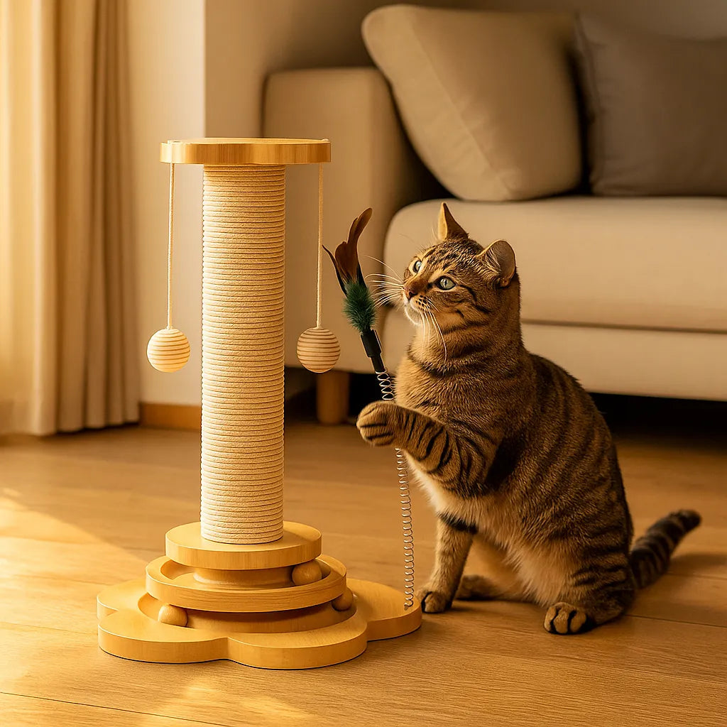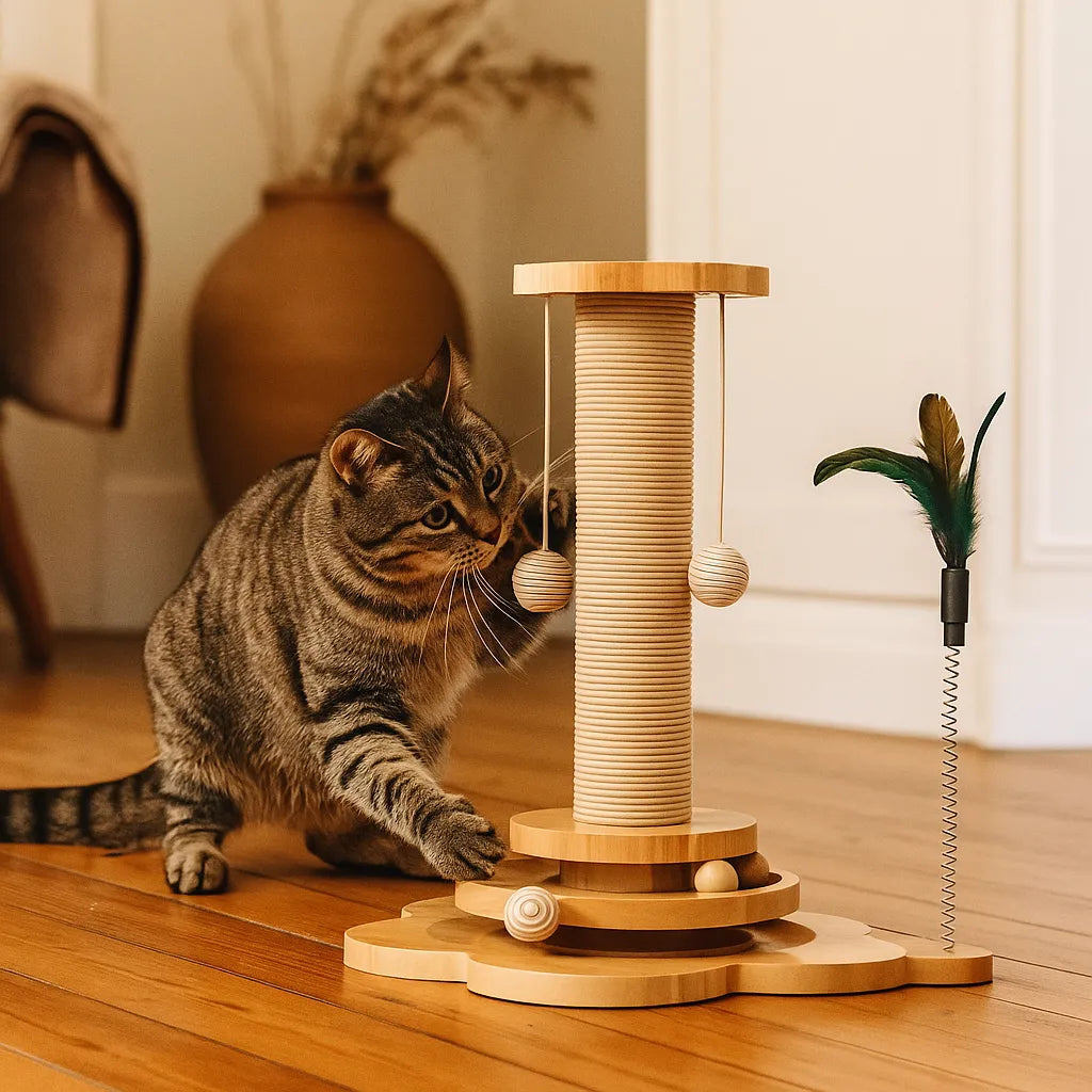 Dieser vielseitige Kratz- und Spielturm bringt alles mit, was deine Katze liebt: Kratzen, Jagen, Klauen und Klettern. Das durchdachte Design aus stabilem Naturholz kombiniert verschiedene Spiel- und Kratzfunktionen in einem kompakten, stilvollen Element – perfekt für moderne Wohnungen und neugierige Stubentiger. Ob beim Klettern, Federfangen oder Balljagen – dieser Turm bietet stundenlange Beschäftigung, auch wenn du mal nicht zuhause bist.