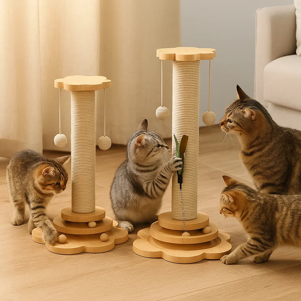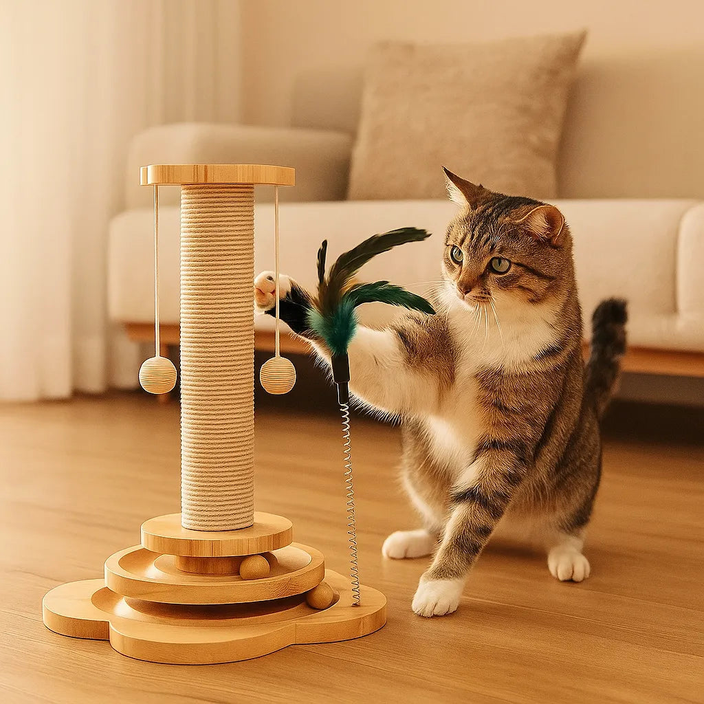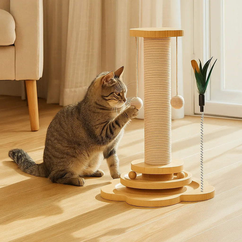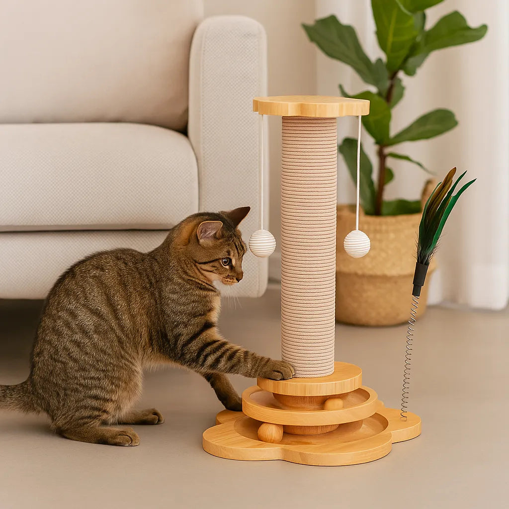 Dieser vielseitige Kratz- und Spielturm bringt alles mit, was deine Katze liebt: Kratzen, Jagen, Klauen und Klettern. Das durchdachte Design aus stabilem Naturholz kombiniert verschiedene Spiel- und Kratzfunktionen in einem kompakten, stilvollen Element – perfekt für moderne Wohnungen und neugierige Stubentiger. Ob beim Klettern, Federfangen oder Balljagen – dieser Turm bietet stundenlange Beschäftigung, auch wenn du mal nicht zuhause bist.