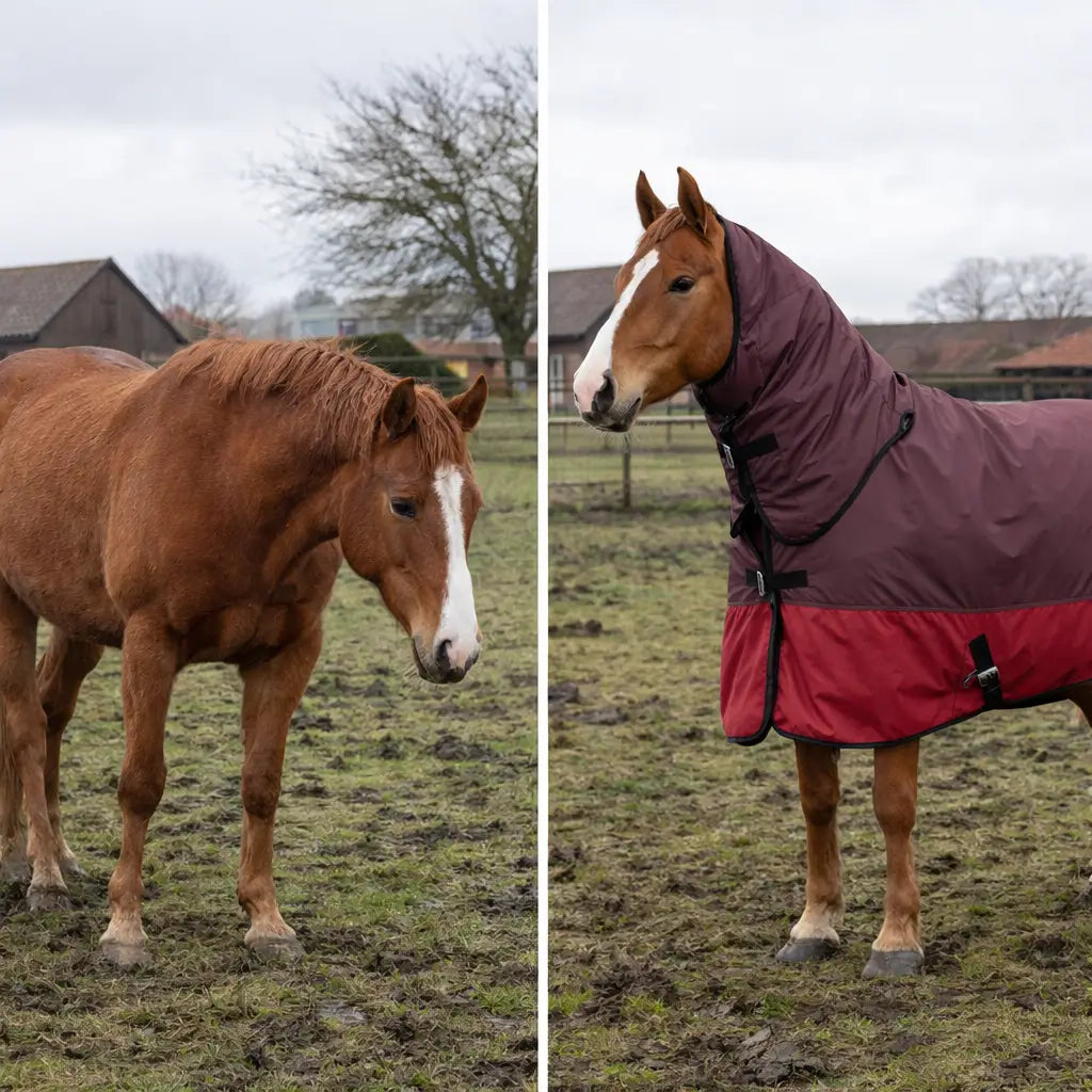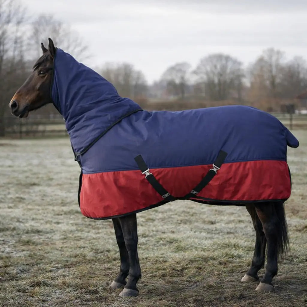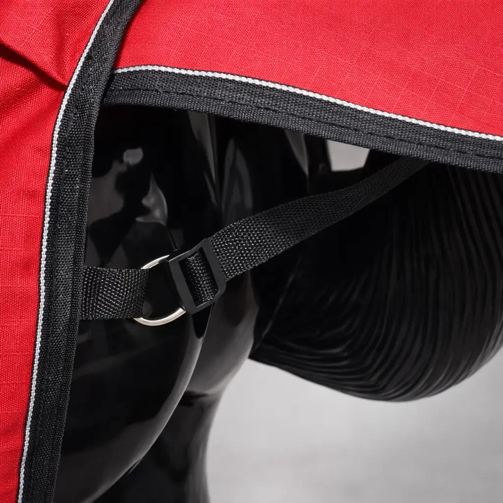 Das reißfeste 600D-Polyester mit 350 g Baumwollfütterung hält dein Pferd warm, schützt vor Regen und Wind und sorgt gleichzeitig für ein angenehmes Klima unter der Decke.