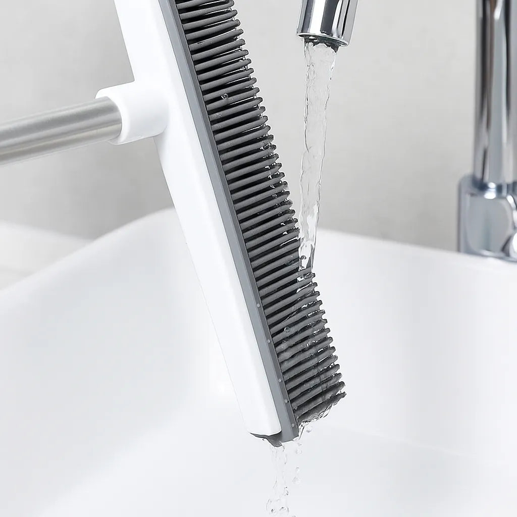Vielseitig einsetzbar: Weiche Gummiborsten schützen empfindliche Böden und der integrierte Abzieher eignet sich perfekt für glatte Oberflächen oder Flüssigkeiten.